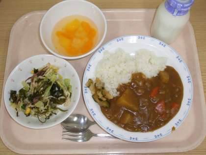今日はコロコロの鶏肉を使った「チキンカレーライス」です。よく炒めた玉ねぎの甘味と、後からきいてくる香辛料のピリッとした辛味が、クセになるおいしさでしたね。