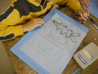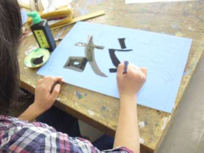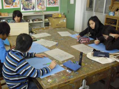 5年生の図工の授業の様子です。新しい作品「一文字から広がる世界」(木版画)の制作に取り掛かりました。自分の名前の一文字を選び、デザインを工夫していきます。図工では、表したいことに合わせて、材料や用具の特徴を生かして使うことがポイントになります。木の素材を生かした作品を目指します。