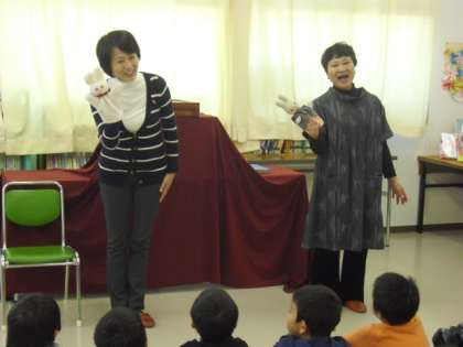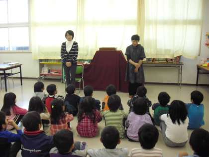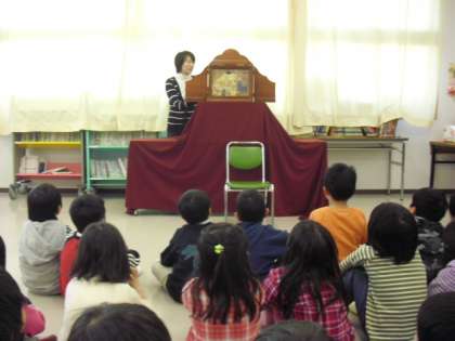 全日本語りネットワークの先生方によるお話会の様子です。今日は1年生です。歌を取り入れたり、人形を使ったり、紙芝居をしたり、読み聞かせをしたりと様々な手法で子どもたちをお話の中に引き込んでいきます。子どもたちの読書への興味・関心が広がります。