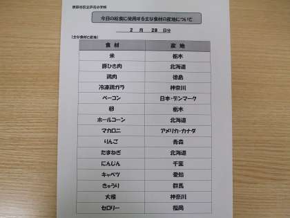 今日で2月も終わり、いよいよ明日から3月ですね。3月は1年間のまとめの月です。自分の食生活や1年間の給食を振り返り、残りの給食も毎日楽しく食べましょう。