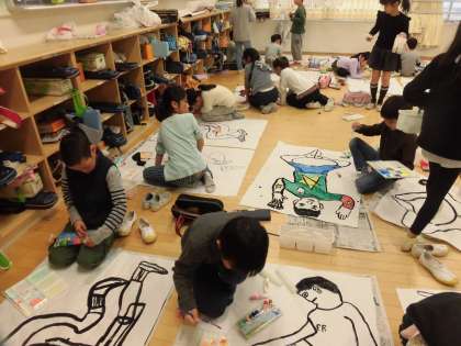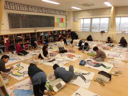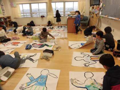 28日(木)の5・6時間目、3年1組と5組は図画工作の時間でした。「もう一人のわたし」の制作に取り組んでいました。1組と5組は紙に写した「わたし」に着色をしました。写し取ったときの洋服や靴下の色や柄を再現していました。