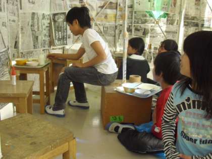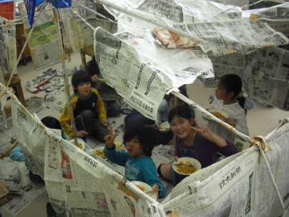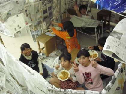 4年生の図工の授業の様子です。午前中の授業でグループごとの「かくれが」が完成し、自分たちの「かくれが」で給食を食べているところです。「かくれが」での給食は格別のようで、みんなニコニコ笑顔で食べていました。