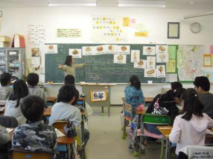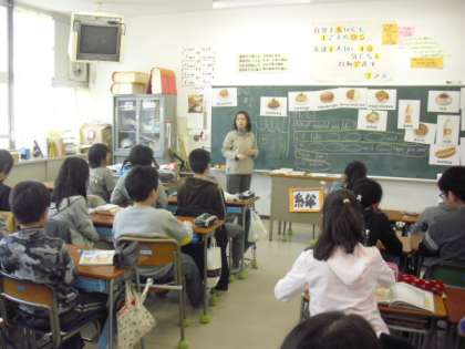 5年生の英語活動の授業の様子です。指導しているのは3年生の守屋先生です。1年生から4年生まではALTのエンキ先生による英語活動の授業を展開していますが、高学年は担任が授業をしています。高学年のクラスを借りて、1年生から4年生までの担任も英語活動の授業を行い、学習内容や指導方法について理解を深めています。