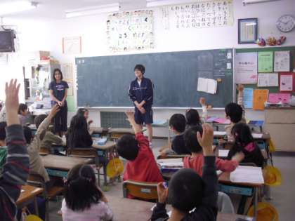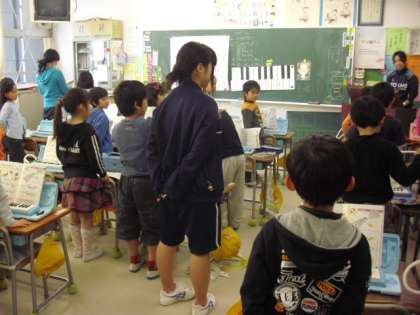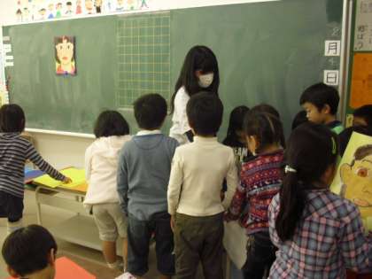 1年生を担当している生徒の様子です。上の写真は音楽の授業です。子どもたちと一緒に歌を歌っています。次の写真は図工の授業です。画用紙を配るのを手伝っています。下の写真は国語の授業です。生徒がクイズを出題しています。