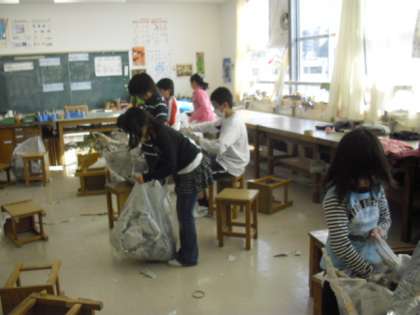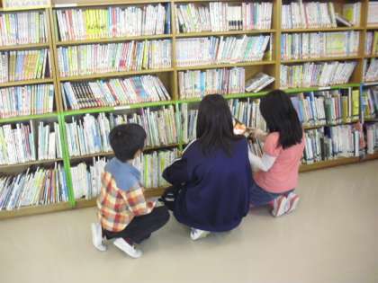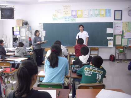 上の写真は4年生の図書の授業の様子です。子どもたちが本を選ぶのに相談にのっているところです。次の写真は4年生の図工の授業の様子です。新聞紙のかくれがの片付けを手伝っています。下の写真は6年生の授業の様子です。もうすぐ中学へ進学する子どもたちの質問に、自分の経験から答えているところです。