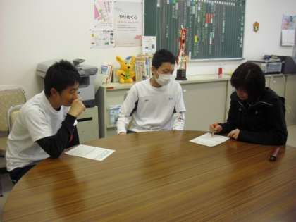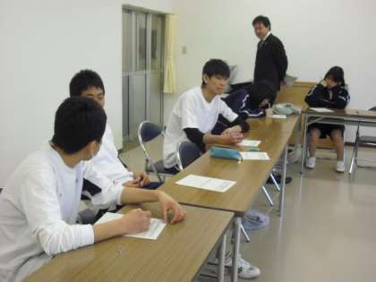 実習が終わり、会議室で振り返りシートに記入しているところです。一日の活動を通じて気付いたこと学んだこと、感想などを書いています。書きあがった振り返りは渡部校長が点検し、生徒と会話をしながら活動の価値付けをしています。