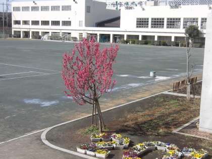 雨が上がった5日(火)、校庭の隅には水たまりがありましたが、紅梅が美しく咲き誇っていました。よく見ると鳥が留まっていました。