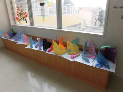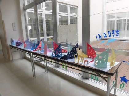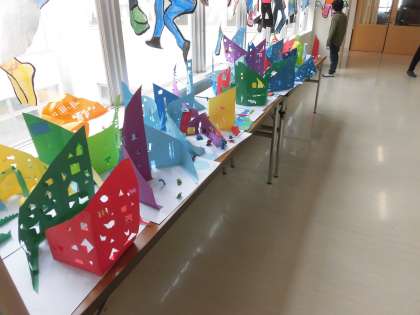 2年生の廊下や教室には、図画工作の時間に制作した「カッターナイフタワー」が展示されています。図工専科の先生から使い方を教わったカッターナイフで、切り込みをしたり、切り抜きをしたりしました。安全に真剣に取り組んでいる姿が浮かんできます。