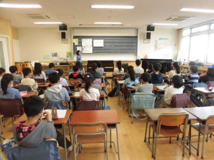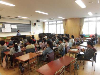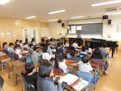 11日(月)の2時間目、3年5組は音楽の時間でした。前半はリコーダーの練習をしていました。3年生は一年間で下の「ミ」の音から上の「レ」の音まで出せるようになりました。特に下の音はかすれがちになりますが、練習曲が一音ずつ低くなるように作られているので、「ミ」の音もきれいに出ました。