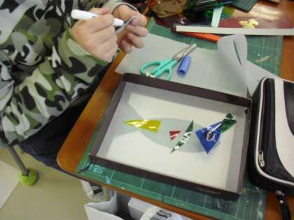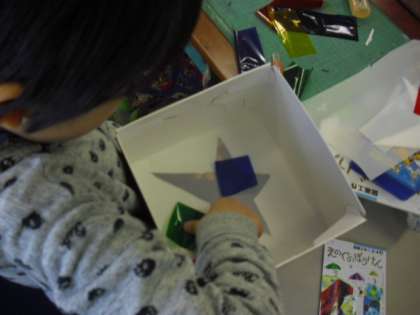 3年生の図工の授業の様子です。「光と色のファンタジー」に取り組んでいるところです。工作版ステンドグラスという作品です。空き箱の面を好きな形に切り抜き、カラーセロファンを貼っていきます。細かな工夫はこれからです。