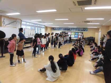 12日(火)、合唱団の朝練習がありました。いつものように「青い竜」の練習をしましたが、午前7時50分から合唱団の体験会に変わりました。2年生以上の体験希望の子どもたちが団員に連れられて音楽室に入ってきました。団員も興奮気味でしたが、発声練習を一緒にしたり、「ふるさと」の歌を歌ったりして過ごしました。