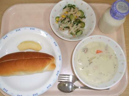 今日は1年生のクラスで一緒に配膳をしました。4月は先生がよそっていたシチューも、自分たちできれいに盛り付けられるようになりました。