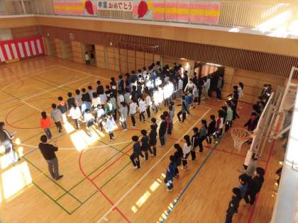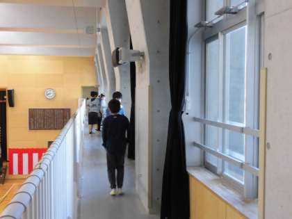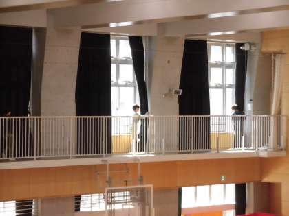 全校朝会が終わると、体育館の入り口に近い学年から行進をして退場します。順番が来るまで子どもたちはその場で足踏み行進をしていますが、6年生は2階ギャラリーに上がり、暗幕を開ける仕事をしています。体育館を最後に出るのが6年生なので、それまでずっと足踏み行進を続けています。列がそろい、足が上がっていて、とてもかっこいいです。この姿を見ながら後輩達が育っていきます。体育館を出たときに、「ありがとうございました。」という挨拶があってすてきでした。