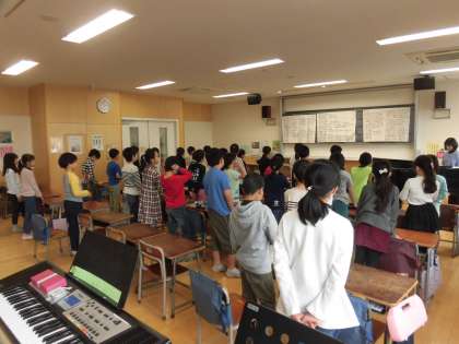 19日(火)の3時間目、3年4組は音楽の時間でした。今年度最後の音楽でした。これまでに習った歌を歌ったり、「パフ」の合奏をしたりして音楽のまとめをしました。