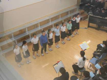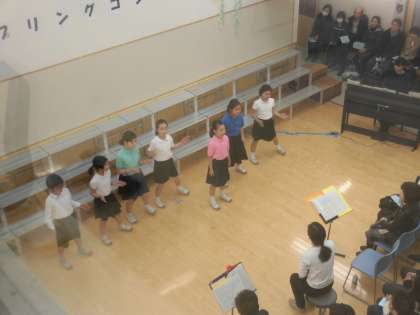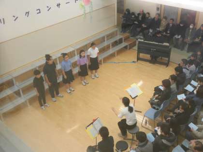 歌を披露する前に6年生が曲目紹介をしました。今回はさらに、自分の好きな歌を紹介してサビの部分も歌いました。一人で曲目紹介をするのも緊張しますが、歌まで歌ったのには感動しました。写真は上から、4年生「いろんな木の実」「パレードホッホー」、5年生「冬げしき」「いつでもあの海は」の様子です。5年生は5人で2曲披露しました。
