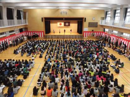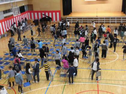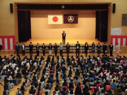 担任発表に続いて専科の先生、主事室や事務室の紹介をしました。児童の言葉は6年生でした。4人が登壇し、最上級生としての抱負をしっかりと述べることができました。始業式が終わり、6年生と先生達で入学式用に会場を整えました。限られた時間の中で声を掛け合い、助け合っている6年生の姿がとても素晴らしかったです。