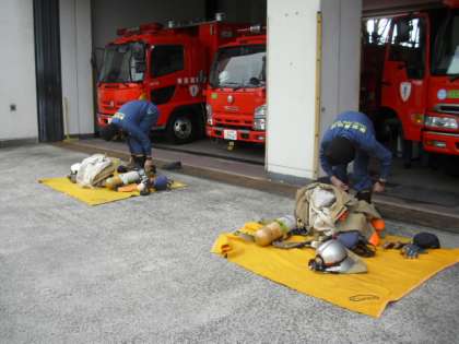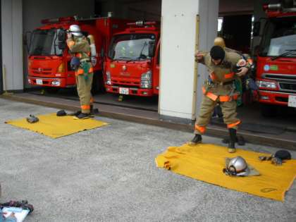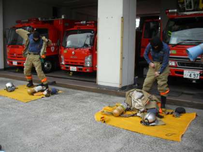 通報があってから着装する時間は1分です。その速さに子どもたちも驚いていました。私たちを災害から守るために一刻も早く現場に駆けつけるためです。酸素ボンベが約10キロ、消防服が約5キロ、装備などをあわせると約20キロほどの重さを身に着けていることになります。