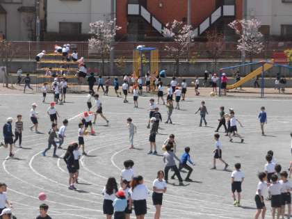 9日(火)の中休み、待ってましたとばかりに子どもたちが校庭に出てきました。新しいクラスの友達と一緒に遊ぶ姿がありました。元気な声が響いていました。