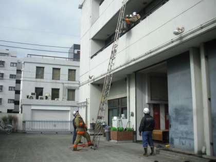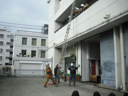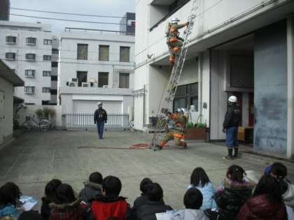 隊長から救出用のロープを上げる指示が出され、2階に取り残された人(人形)をロープで固定し、地上に下ろしているところです。「訓練でも命がけでやっています」という言葉通り、緊迫した様子に子どもたちも釘付けです。