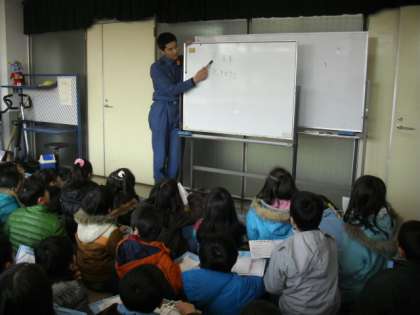 質問コーナーの様子です。子どもたちの手がたくさん挙がります。一つ一つの質問に丁寧に答えてくれました。子どもたちは一生懸命にメモを取ります。昨年度の成城消防署管内で起きた火災は83件、救急車の出動回数は9275回だったそうです。