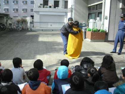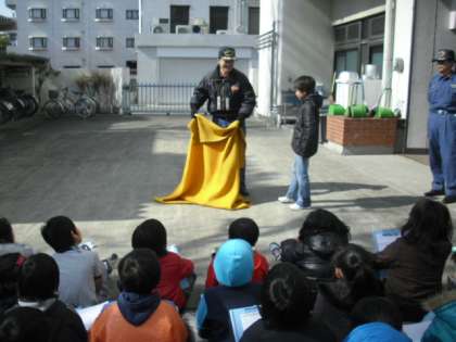 再び外での質問コーナーです。「消火器や水がないときに、火を消す方法はありますか?」の質問に、「たとえばキャンプ場で衣類に火がついた場合、毛布などを使って空気が入らないようにします。」と子どもと一緒に実演してくれました。