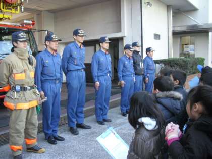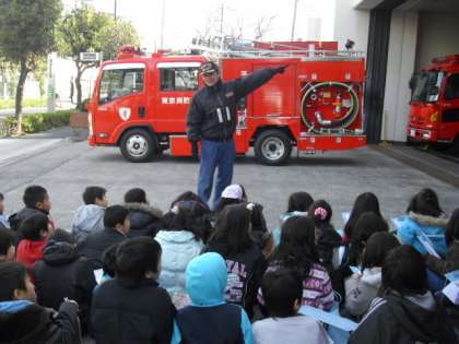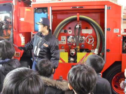 最後に消防車を間近に見ることができました。ホースの太さや様々な装置に子どもたちも興味津々です。私たちの地域の安全を守るために働いている方々の話から、子どもたちはたくさんのことを学びました。学習したことは新聞にまとめます。成城消防署千歳出張所のみなさん、ありがとうございました。