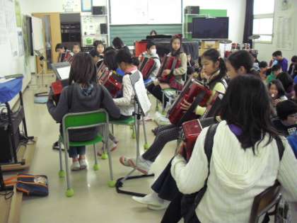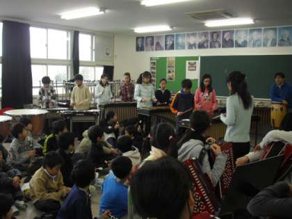 6年生の音楽の授業の様子です。学年合同で「剣の舞」の合奏の練習をしているところです。学年が集合すると音楽室も満員です。打楽器のタイミングを合わせる練習を何回もしました。