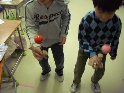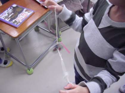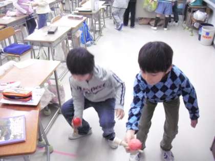 中休みの2年生の様子です。連休の雨と雪のため校庭がまだ使える状態ではないので内遊びでした。2年生の教室の前を通ると、けん玉名人を発見。連続技を見せてくれました。ブンブンゴマで遊んでいる子どももいました。学習したことが生かされています。