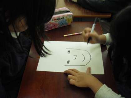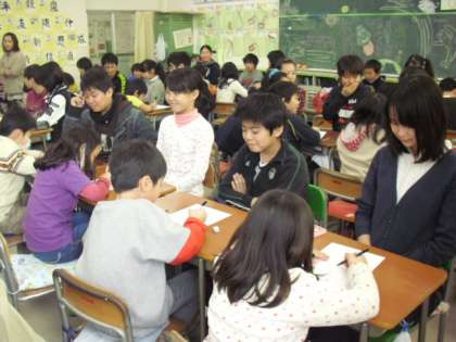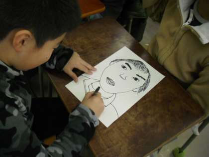 3年生が6年生の教室に行って6年生の似顔絵を描いているところです。間近で向かい合っているので、はじめはお互いに照れくさそうでした。でも、6年生の顔をよく見ながら描き始めます。