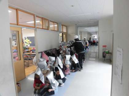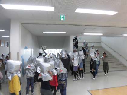 学校では毎月避難訓練を実施します。今月は12日(金)に行いました。地震が発生したと想定して、避難経路の確認までを行いました。緊急放送が流れ、地震だとわかるとすぐに机の下に潜り込みました。その後、防災頭巾を被って廊下に並び、人数確認をした後、避難経路の確認のため、校内を歩きました。「お・か・し・も」の約束を守って静かに訓練ができました。