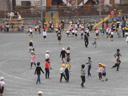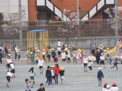 12日(金)の中休み、黄色い帽子を被った1年生が校庭に出てきました。この日から校庭遊びができるようになったためです。ジャングルジムや滑り台、うんていなどの遊具が大人気でした。上級生と手をつないで校庭を歩く1年生もいました。とてもよい雰囲気でした。