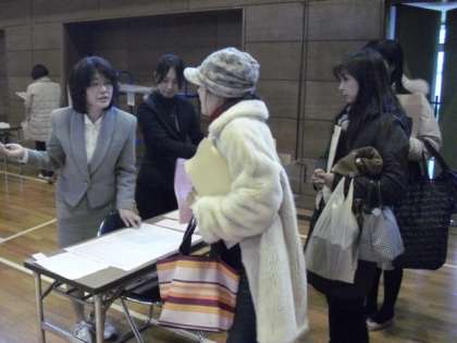 平成23年度の新1年生保護者説明会の様子です。受付を済ませ、通学路を確認しているところです。説明会では、渡部校長から本校の教育について、1年各担任から1年生の生活と準備について、写真は養護教諭が保健についての話をしているところです。