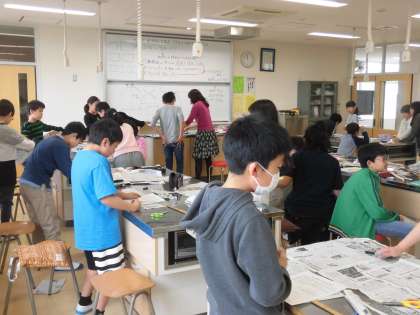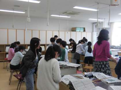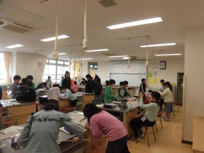 15日(月)の3・4時間目、6年1組は家庭科の時間でした。「エプロン制作」のための型紙作りをしていました。たての長さに縫い代をプラスして型紙に印を付けていきます。先生の点検に合格した人から型紙を切り始めました。