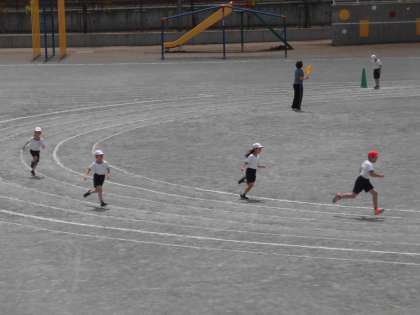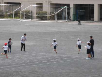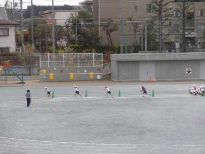 15日(月)の4時間目、3年4組と5組は体育の時間でした。80mを走り、そのタイムをとりました。担任2人が記録をとるため、職員室にいた他の学年の先生がスターターを勤めました。「ゴールまでしっかり走って!」と担任の声が響いていました。