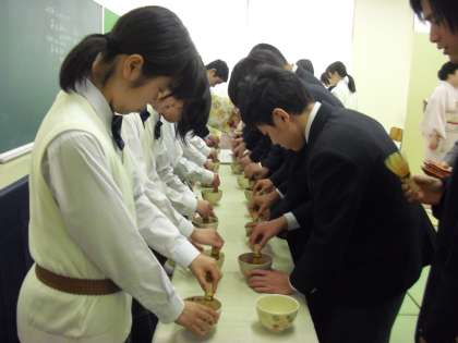 お茶をたてているところです。緑茶の香りが教室に広がります。生徒は真剣な表情で作業をしていました。講師の先生から作法についての話もありました。