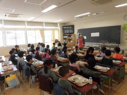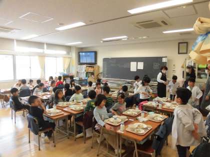 給食当番以外の子どもたちは順番に前に進み、お盆に次々と載せられる食器を気にしながら自分の席までもどることができました。みんなで「いただきます」とあいさつをしながら、初めての給食を喜んで食べていました。