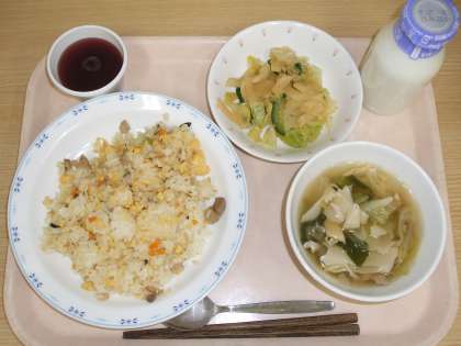今日の給食は中華でした。「チャーハン」にはにんじんや卵の他にも、枝豆が入り、彩りよく仕上げていただきました。また「野菜の中華風味」はさっぱりとしていて、味のバランスもよかったですね。