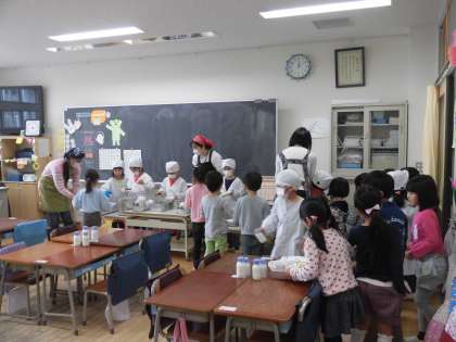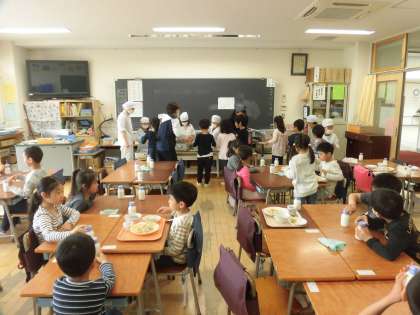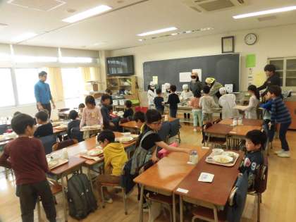 1年生の子どもたちは給食の時間も楽しみにしています。「おいしかった。」と笑顔で話しています。写真は上から、3組、4組、5組の様子です。