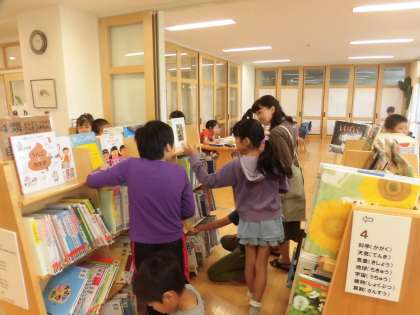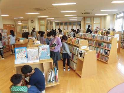 18日(木)の3時間目、4年3組は図書の時間でした。図書は国語の学習の一環として取り組みます。今年度から民間の司書の先生が常時図書室にいることになりました。最初に図書室の利用の仕方を確認してから、読み聞かせをしていただきました。その後、読みたい本を探しました。探すときには司書の先生に相談をする姿も見られました。