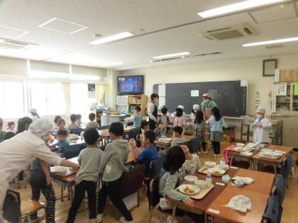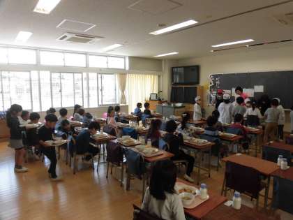 1年生の給食も4日目になりました。少しずつ慣れてきていることがわかります。担任の先生がそんなに声をかけなくても自分たちで動く姿が見られました。写真は上から、1組、3組、5組の様子です。