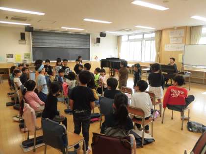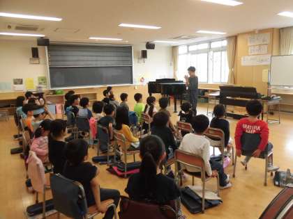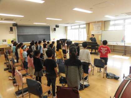 19日(金)の5時間目、2年1組は音楽の時間でした。第二音楽室で学習しています。「春がきた」の歌を練習しました。1人ずつ歌う歌のリレーにも挑戦しました。