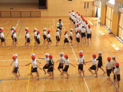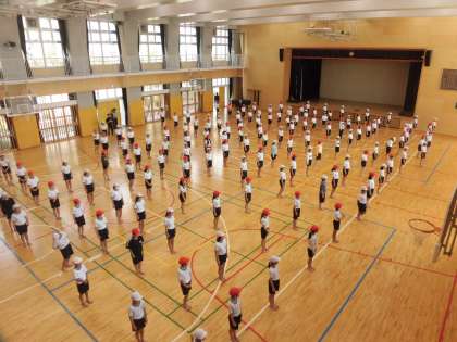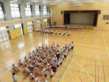 19日(金)の5時間目、6年生は合同体育の時間でした。体育館で行進の練習をしていました。これは運動会で披露する団体演技の一部です。一定のリズムで歩幅をそろえて歩けるように練習をしています。
