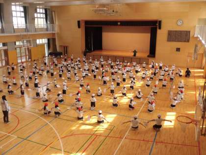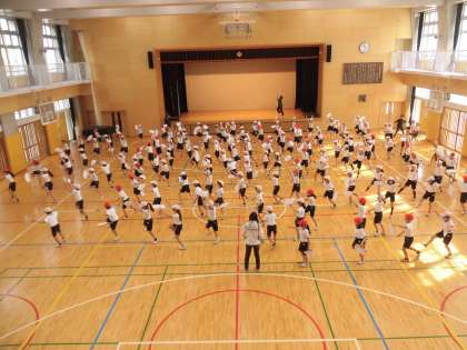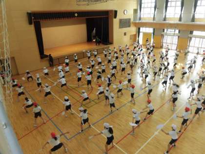 19日(金)の6時間目、5年生は合同体育の時間でした。運動会の団体演技で披露する「御神楽」の練習をしました。おそろいの扇子を手に、今回で3回目の練習です。手や足の動きを確認しながら、主指導の先生と一緒に踊っていました。