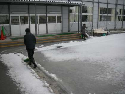 今朝の登校前の学校の様子です。昨夜降り積もった雪が敷地内を埋め尽くしています。子どもたちが安全に入室できるように、出勤した教員・主事さんで通路を確保しているところです。