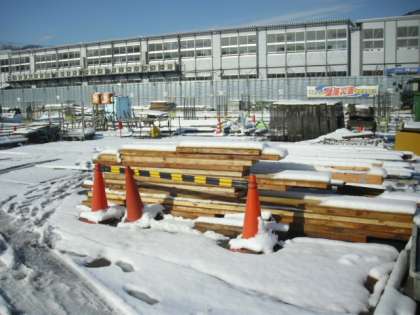 今日の工事現場の様子です。学校と同じく雪景色の中の工事現場の様子です。この写真は体育館予定地前です。担当の人が状況を確認しています。保育園予定地には雪が積もっています。今日も安全に工事が進むことを願っています。