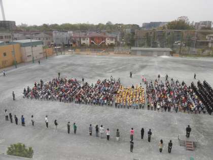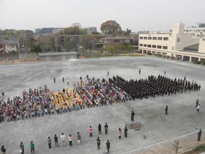 22日(月)、今年度第1回目の小中合同朝会を行いました。小学生と中学生が校庭に整列し、小学校の校長先生のお話を聞きました。「小学生も中学生も気持ちのよいあいさつをしましょう。」という内容でした。黄色い帽子を被って参加しているのが1年生です。児童・生徒を合わせて1300人の大集団でした。