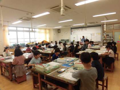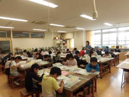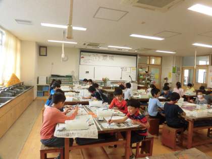 24日(水)の1・2時間目、4年5組は図画工作の時間でした。絵の具の濃さを調べ、徐々に水分を増やして色の変化を比べました。水分が少ないと筆の動きが重く感じられて色がのびないなど、子どもたちは水の量と色の関係を見つけていました。
