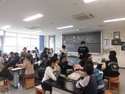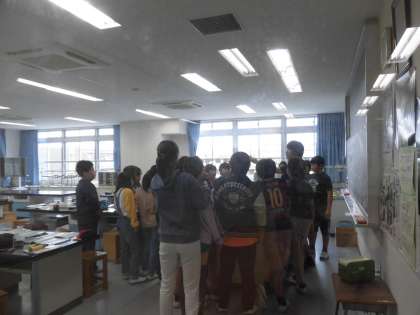 24日(水)の1・2時間目、6年4組は理科の時間でした。理科室で「ものの燃え方と空気」の実験をしていました。ろうそくが燃える前と燃えた後の空気中の気体の体積の割合を調べました。気体検知管とポンプを使うこともできました。