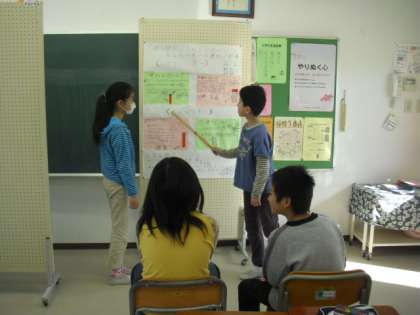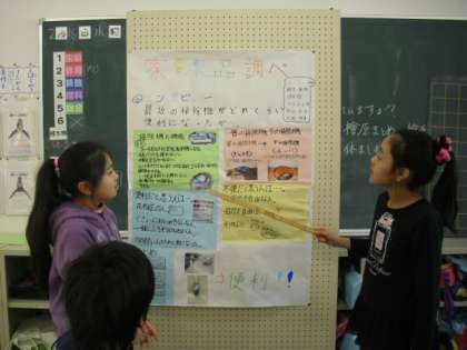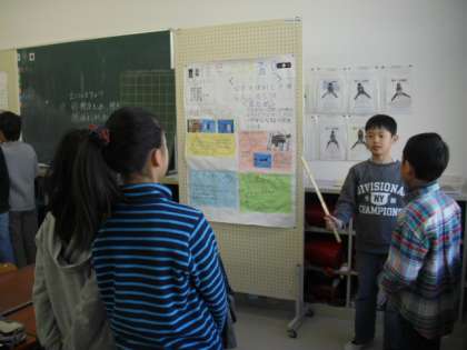 4年生の国語の授業の様子です。ポスターセッションのリハーサルをしているところです。地域にある便利や施設等について調べました。なぜ便利か、誰のために便利か、なぜよいのか等、調べたことからまとめたことを相手に伝えるのが今回のねらいです。