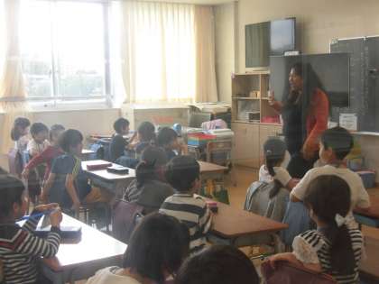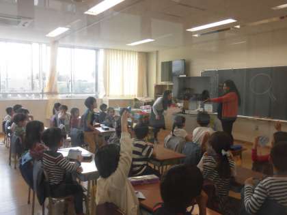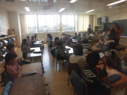 25日(木)の6時間目、2年4組は外国語活動の時間でした。英語専科の先生とALTの先生と一緒に学習をしました。ウォーミングアップとしてALTからクイズが出題され、子どもたちも楽しんでいました。